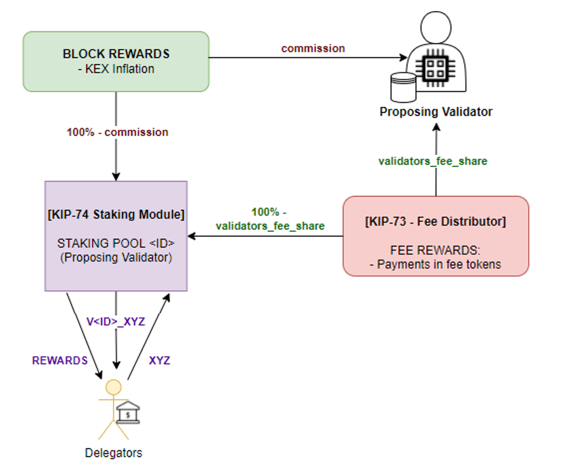 Block rewards are fixed amount of KEX tokens minted in each block — The block proposer takes a cut according to its own staking pool’s commission rate while the remainder is shared between its delegators according to the total value of all the tokens they have delegated among all active staking pools. Hence, block rewards compensate delegators proportionally to the risk they are taking network-wise — this is similar to Cosmos rewards distribution.